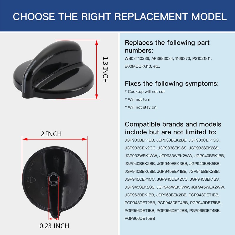 • 【Perfect Replacement】Our 4 Pcs WB03T10236 Range Burner Control Knobs replace part numbers: AP3883034, 1166373, PS1021811, B00MOCKG10. The diameter measures approx: 2 x 2 x 1.5 inches.