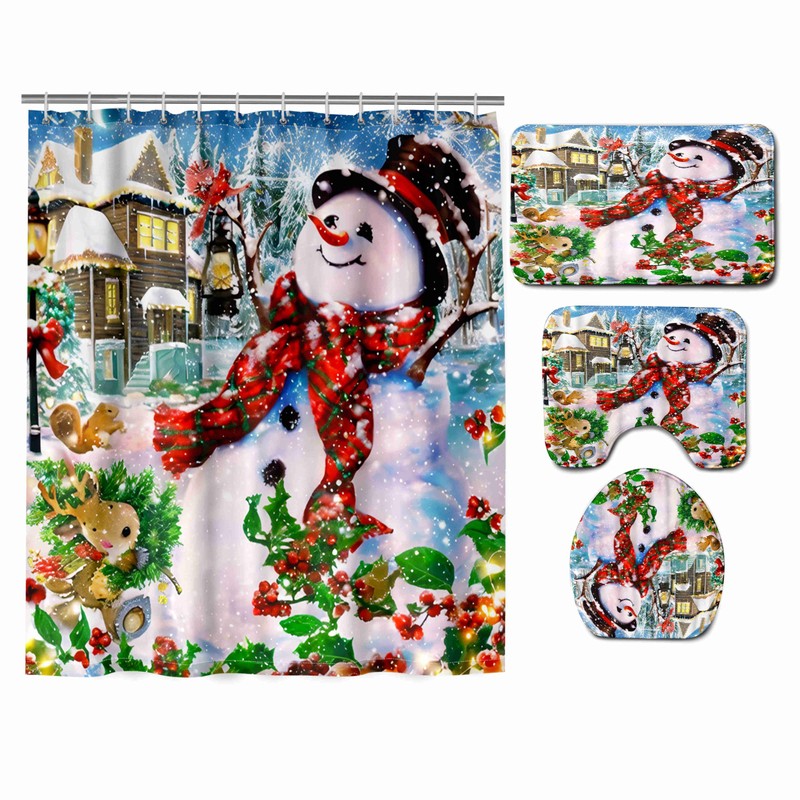 4 Pcs Winter Merry Christmas Shower Curtain Sets with Rugs Snowman Bathroom Set Home Bath Bathtub Decor Xmas Tree Durable Curtains Mats for Bathroom 72 x 72 Inch