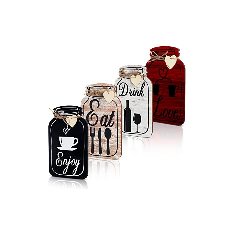 - Kitchen Decor: 4 pieces of kitchen themed wooden mason jar signs printed with 4 different words come to in each package, namely [eat], [drink], [love] and [enjoy], decorating these signs on the wall in your kitchen can add a touch of sweet and warm breath