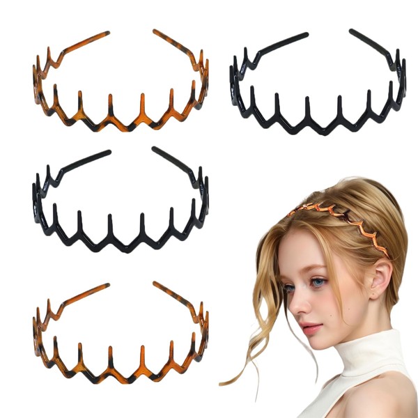 4 Pcs Zig Zag Headband, 90s Zigzag Headbands, Plastic Wavy Hairbands with Shark Teeth Comb Design, Non-Slip Elastic Headbands for Women Men Girls, Unisex Hair Accessories (Black, Brown)