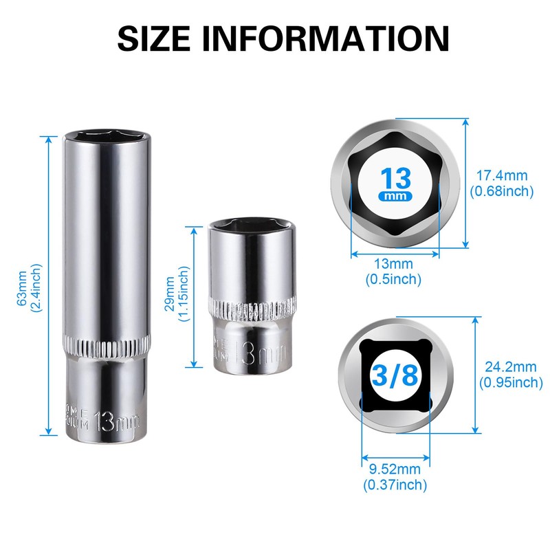 - 【Set Includes】 2 pieces of 6 points 13mm deep sockets and 2 pieces of 13mm shallow sockets with 3/8-inch drive, compatible with standard ratchets and tools.
