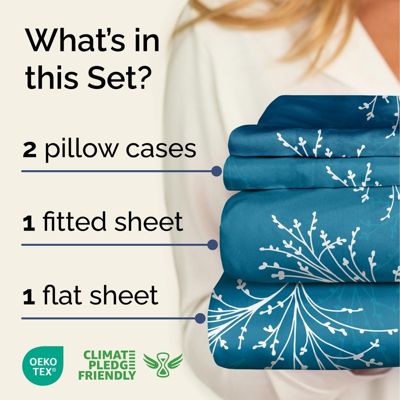 4 Piece Blue Sheets Full Set – Luxury Flat Sheet 81 x 96, Fitted Sheet 54 x 75 and 2 Pillowcases 20 x 30 – Deep Pocket, Ultra-Soft, Boho Botanical Bed Sheets – Oeko-TEX Blue Floral Sheet Set