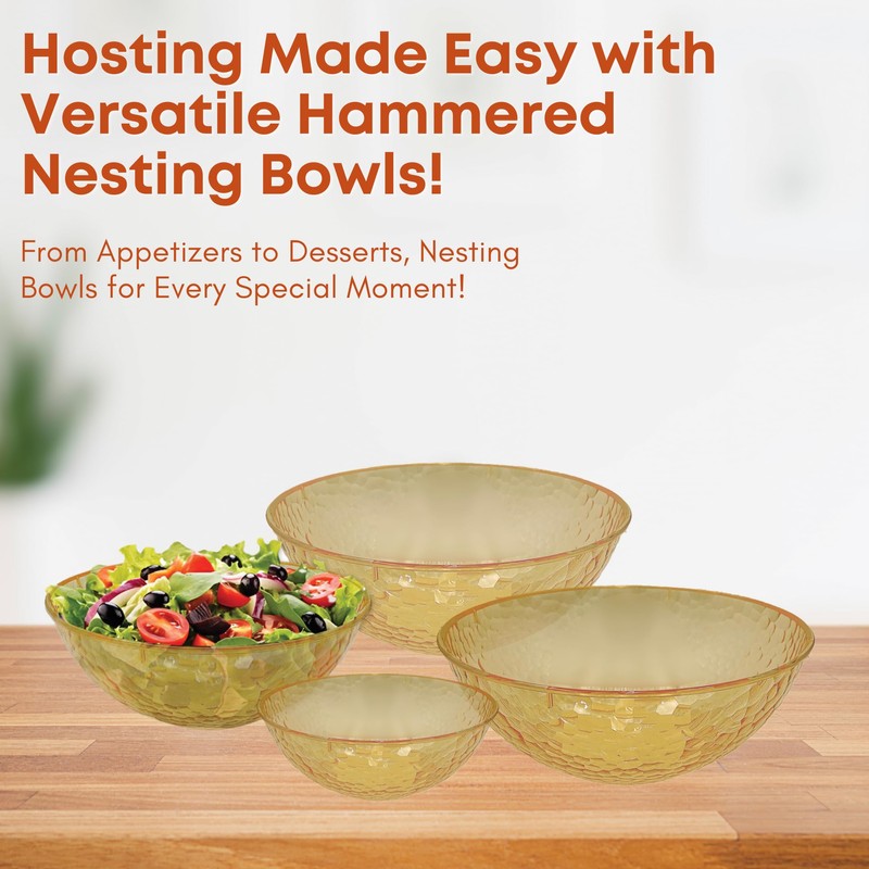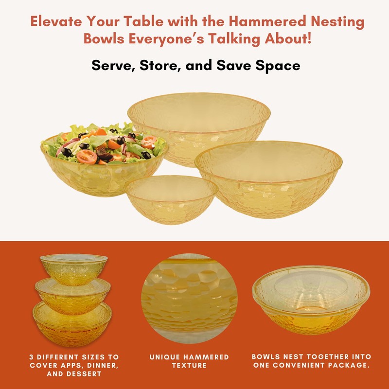 - Space-Saving Design: Modern hammered pattern bowls nest inside one another for easy storage, saving valuable cabinet space while adding style to your kitchen.