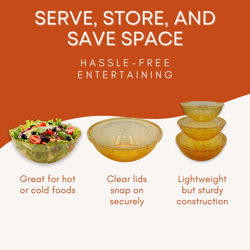 - 4-Piece Nesting Bowl Set: Includes 2 large (5-quart), 1 medium (3-quart), and 1 small (1.5-quart) bowls with matching lids, perfect for salads, chips, fruits, and dips.