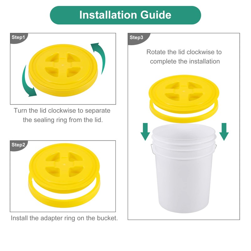 - How to install-Snap the adapter ring on the bucket opening, the bucket lid is opened by rotating, and there are 4 grooves on the surface of the lid to make it easy to open or close by hand; It can be easily installed without additional tools