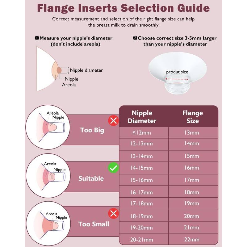 • 【MULTIPLE SIZES BETTER FITTING BREAST PUMPS】:Our flange inserts are available in different sizes:13/14/15/16/17/18/19/20/21/22mm. 10 different size options may vary during breastfeeding and therefore require different sizes of flange inserts for your breast pump.