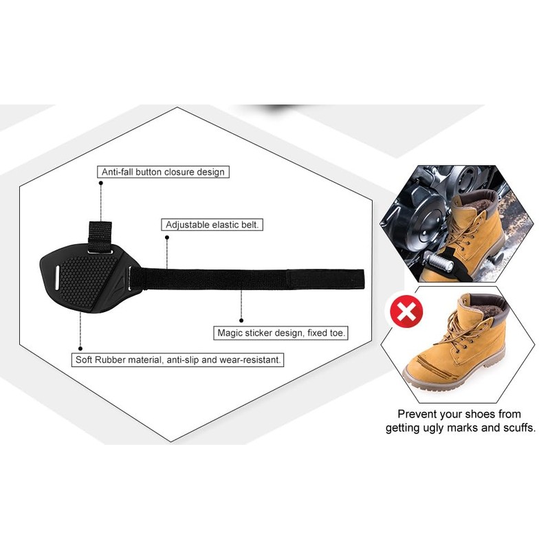 • 🏍️【4-Piece Motorcycle Shifter Pad Set】: This set includes 4 durable rubber pads designed to protect your motorcycle boots from wear and tear caused by shifting gears and contact with the motorcycle's footpeg or shifter.