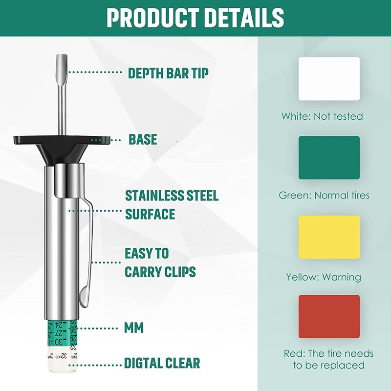 - 【Widely Used】 Tyre tread depth gauge can let you regularly monitor tire tread levels of your car, make you safe driving. Tire tread depth gauge tool reads in 32nds Suitable for trucks, motorcycles, automobiles and any passenger vehicle.