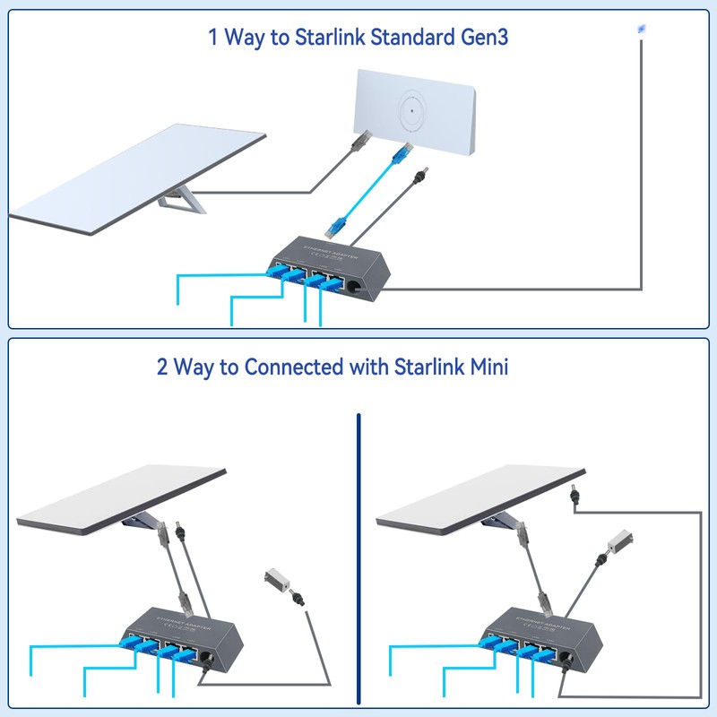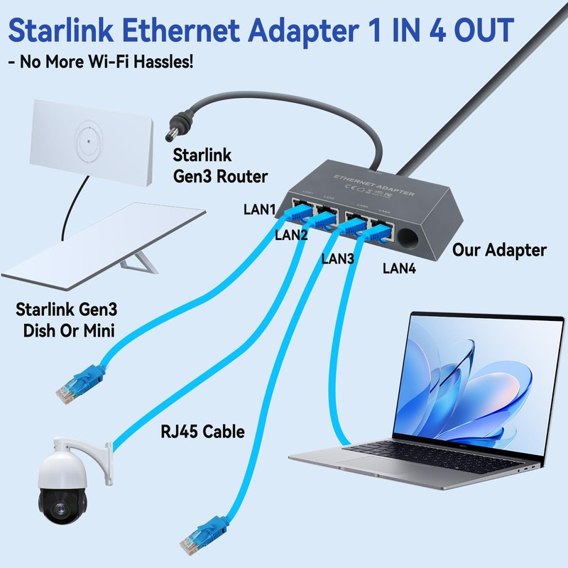 - 4 Port Ethernet Adapter:4 Gigabit Ethernet ports support multiple devices simultaneously, such as PC, TV, router, printer, maximize Starlink's high-speed Internet and provide efficient network expansion solution