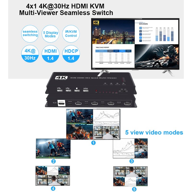4K HDMI 4x1 Quad KVM Multi-viewer is a high performance with four HD screen segmentation and seamless switching output switch. It can display 4 HD digital video signal on the same screen, and has a variety of video segmentation, seamless switching 4 HD input signal synchronously. The control methods of the switch is flexible, it can be switched via button , IR control and KVM control.It’s a very practical and stable switch and easy to install, can be used in the major projects, meeting halls and other places.