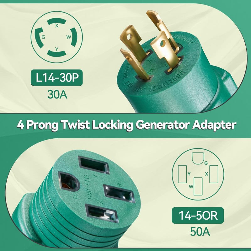 - Simple and integrated design .One side is the L14-30P male plug, the other side is the NEMA N14-50R female connector. Convert the 30A power from the generator into a 50A power for application in your devices .