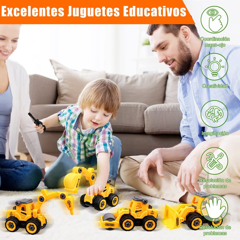 • 【JUEGO DE CAMIONES DE 4 PIEZAS】Recibirás: 4 carritos juguetes para niño (incluyendo Camiones de perforación, apisonadoras, excavadoras, carretillas elevadoras), 1 destornillador y 8 señales de tráfico. Los niños conocerán los diferentes tipos de camiones y aprenderán conocimientos de tráfico al mismo tiempo. Además, podrán mejorar sus habilidades prácticas y desmontar los camiones de juguete para niño para entender mejor su estructura.