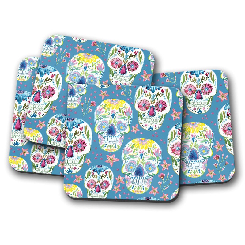 4 Set - Flowery Sugar Skulls Drinks Coaster - Calavera Mexico Dead #8492
