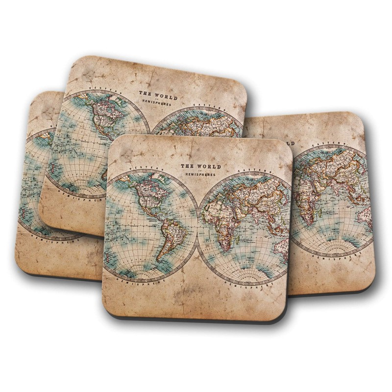 4 Set - Vintage World Hemispheres Map Coaster - Rustic Geography Fun #14392