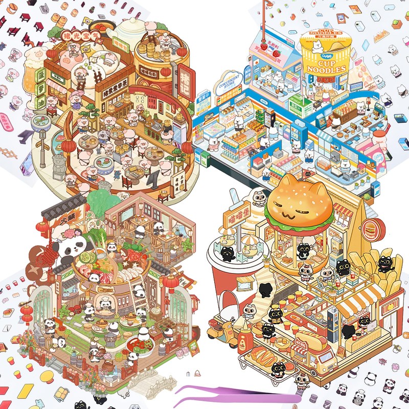 - DIY 3D House Stickers: You will receive 4 sets DIY 3D large size house scene stickers and a tweezer containing 4 different scenes including Panda hot pot restaurant, Cat Burger restaurant, pig breakfast shop, dog convenience store, very fun and creative.