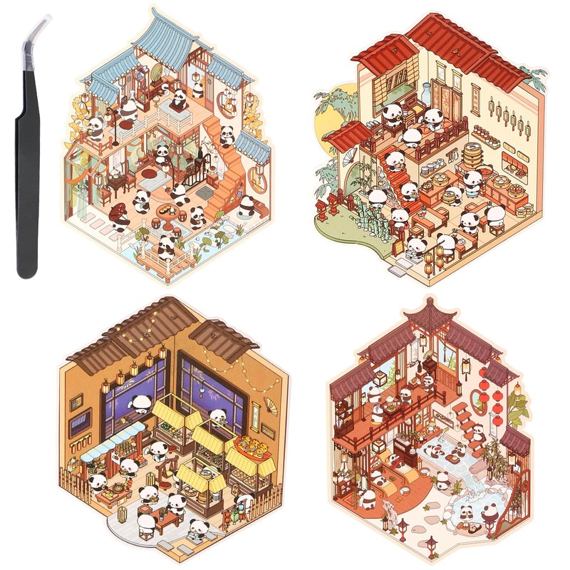 - Panda 3D House Sticker: You will get 4 sets different theme cute panda 3D miniature scene stickers and a pair of tweezers