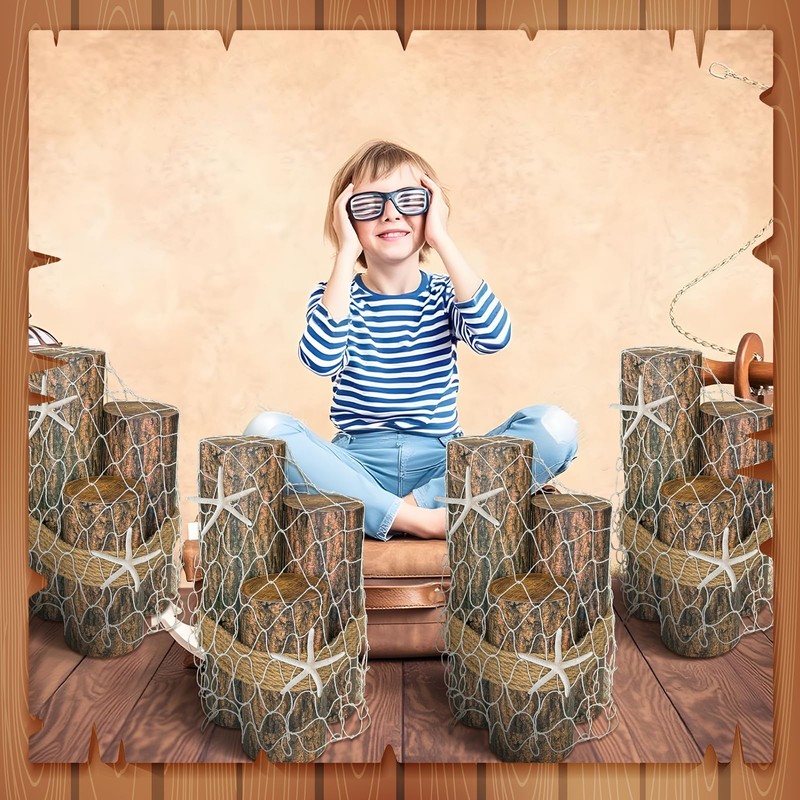 4 Sets Pirate Nautical Party Decoration Imitation Wooden Piling Paper Boxes Fishing Net Starfish for Under The Sea Birthday Ocean and Beach Theme Party Favors Adventure Birthday Photo Booth Props (4)
