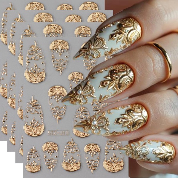 4 Sheets Gold Nail Art Stickers 5D Embossed Flower Nail Decals Metallic Totem Leaves Floral Nails Design Manicure Sliders Self Adhesive French Retro Golden Foil Nail Art Supplies for Women DIY Nail
