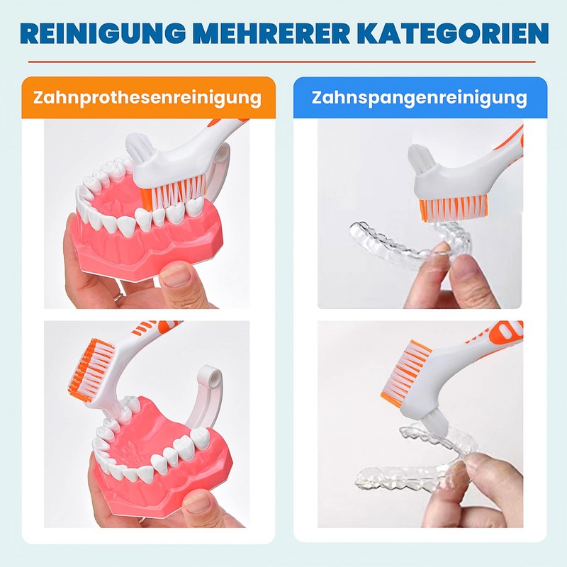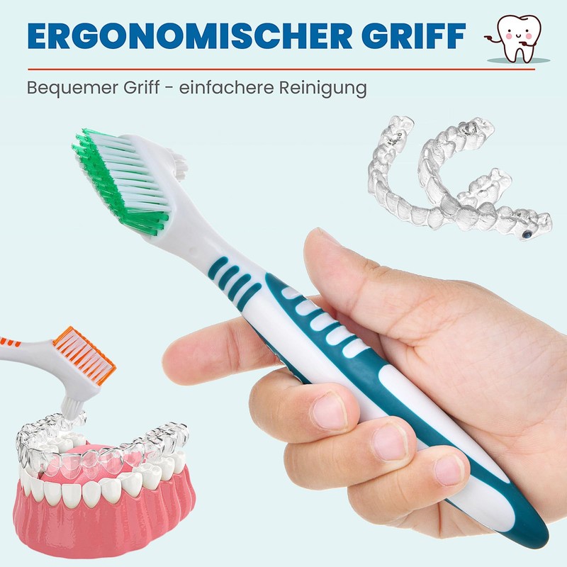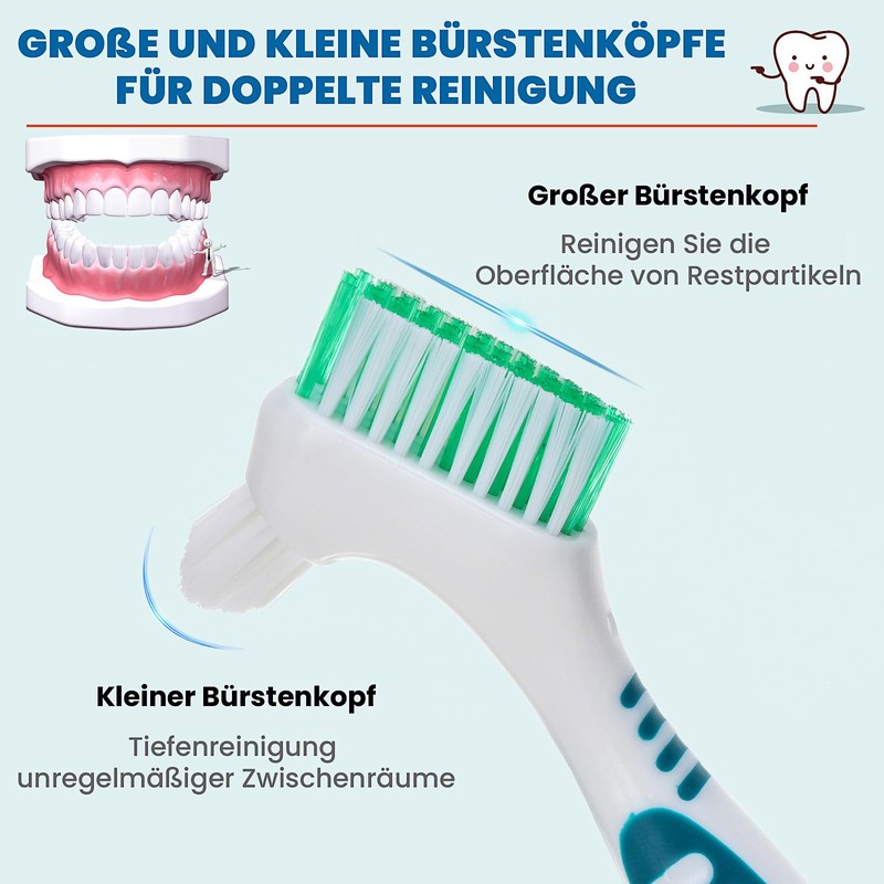 - Effektive Reinigung: Die 4PCS -Zahnpinsel verfügt über ein Doppelborstenkopfdesign, um eine gründliche Reinigung von Zahnersatz, Retainern und falschen Zähnen zu gewährleisten. Die stabilen Borsten entfernen störrische Trümmer und Plaque mühelos.