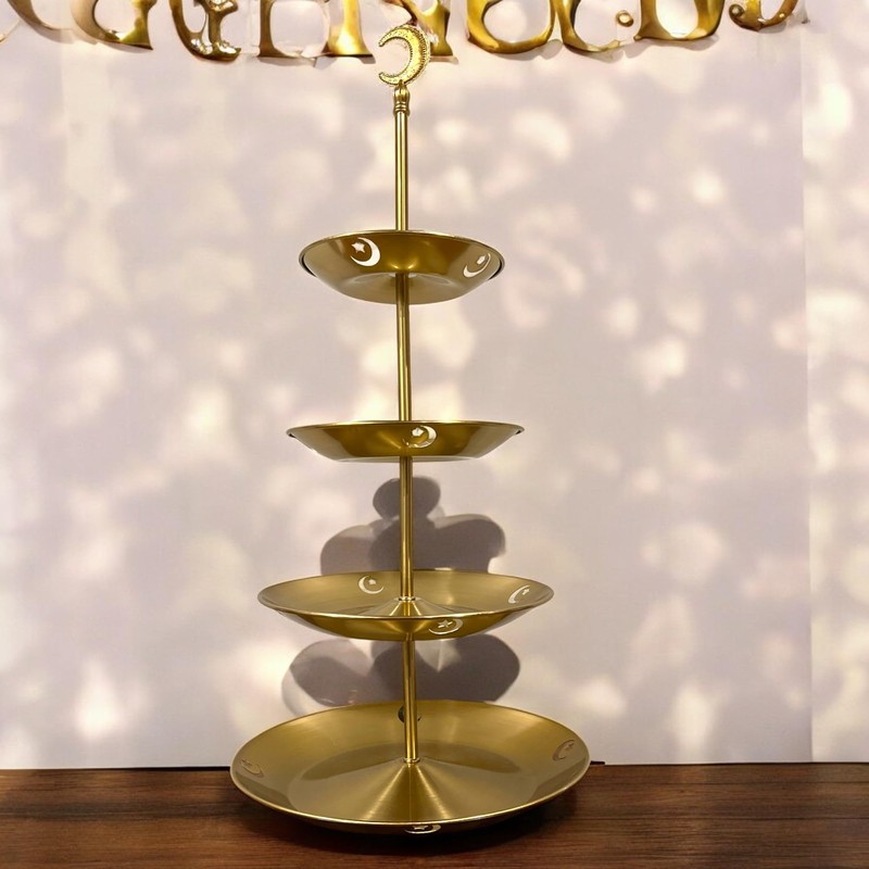 - [Elegant Design] - This 4-tier tray features a luxurious gold finish that adds a touch of opulence to any setting. The standout feature is its crescent moon (hilal) topper, symbolizing elegance and tradition, making it perfect for special occasions, festive décor, or everyday sophistication.