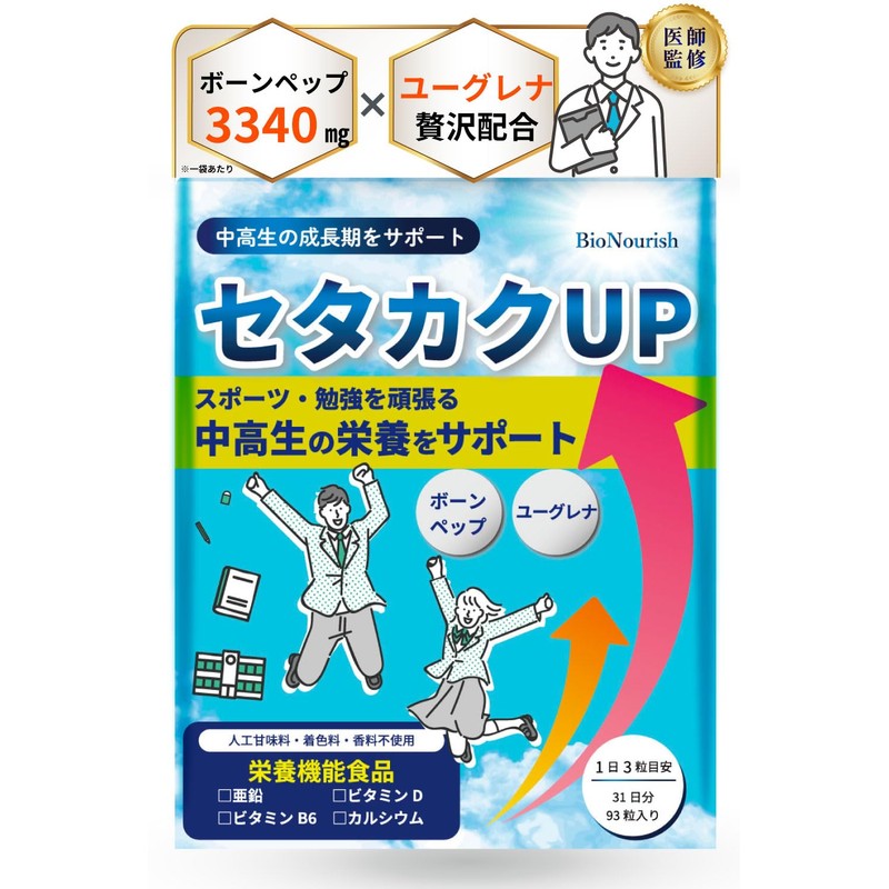 【ボーンペップxユーグレナx4種の栄養機能成分で中高生の伸びる力をサポート】 セタカクUP 【医師監修x製薬会社と共同開発】 カルシウム 成長 身長 サプリ 亜鉛 人工甘味料不使用 93粒 31日分