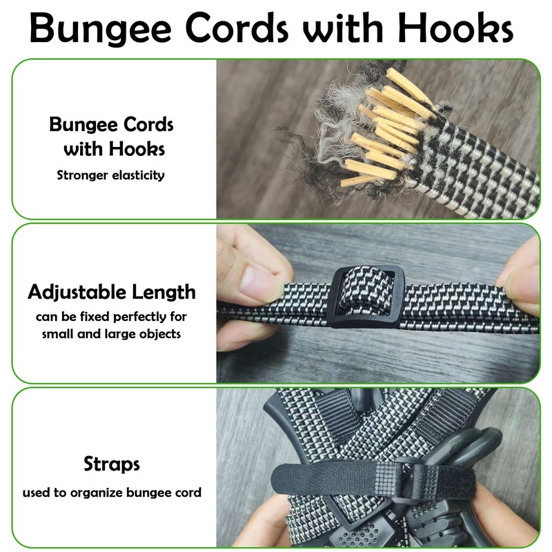 - High Quality Material: Our adjustable bungee cords with hooks is sturdy and durable, with excellent abrasion and corrosion resistance, it can be widely used for mountain climbing, hiking, camping and other outdoor sports.