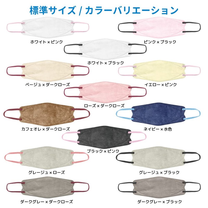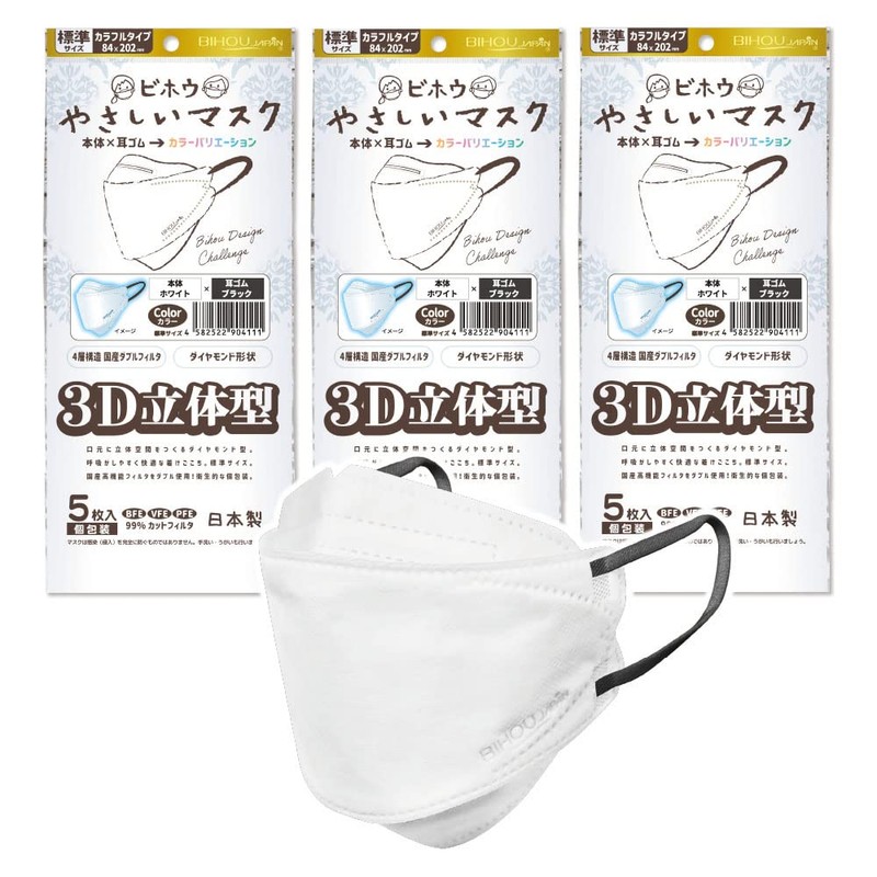 【ビホウマスク 安心の日本製 4層構造 国産高機能フィルタをダブル使用! 本体×耳ゴムの組み合わせで多彩なバリエーション! 個性に合わせて選べる楽しさ】3D立体型やさしいマスク カラフルタイプ (ホワイト×ブラック) 標準サイズ 5枚入 3袋セット