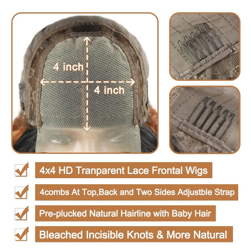 - 4 x 4 lace closure wigs human hair construction: it have adjustable straps and 4 combs around your ears for different sizes of head circumference, elastic net is more breathable and comfortable, free part can be side anyway, cap size is 22.5 inches for medium size.
