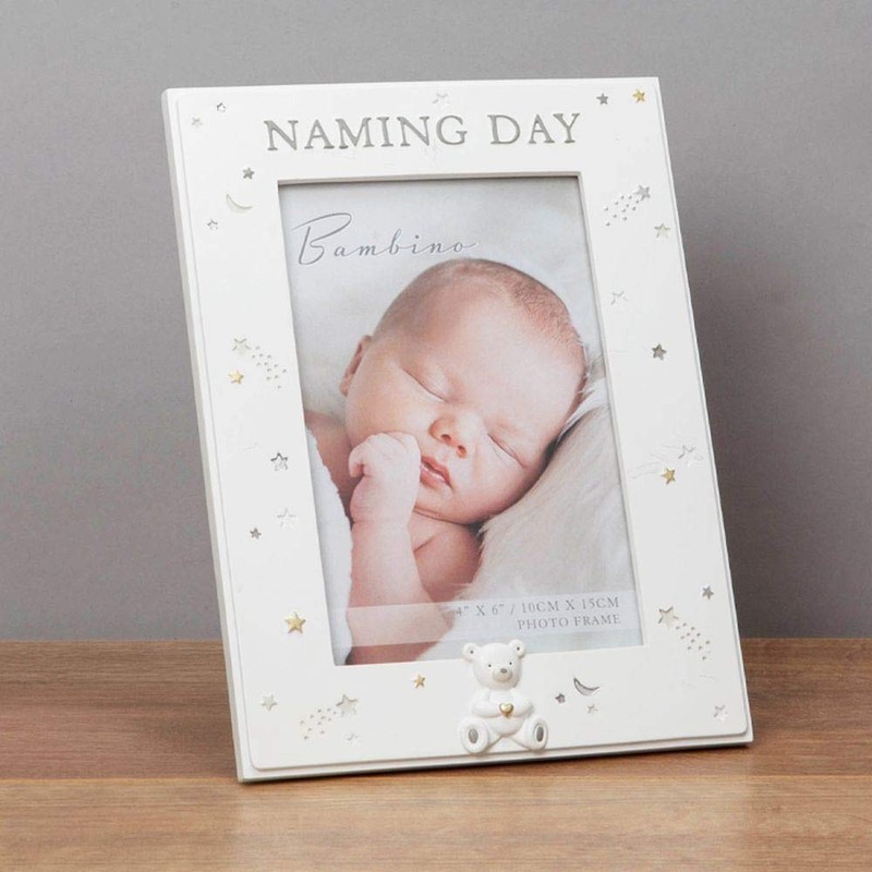Celebrate your beautiful new addition with this 6' x 4' 'Naming Day' photo frame. From Bambino - keeping the earliest memories alive forever.This moulded resin border frame features a crisp white colour with hand painted silver and gold starry design and adorable teddy bear holding a gold heart icon. Includes a luxury grey velveteen standing strut.Complete with Bambino's luxury signature silver foiled lidded gift box.