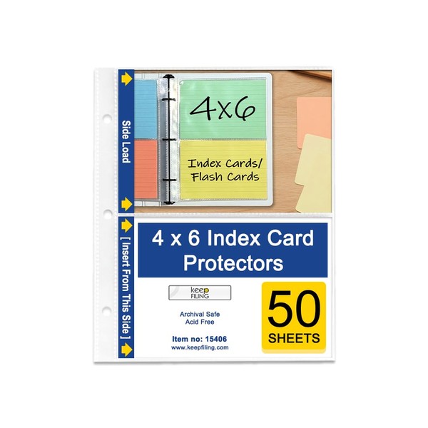 4 x 6 Index Card Sleeves, Flash Cards, for Mini 3-Ring Binders, Hold 2 Cards, Keepfiling, 50 Sleeves