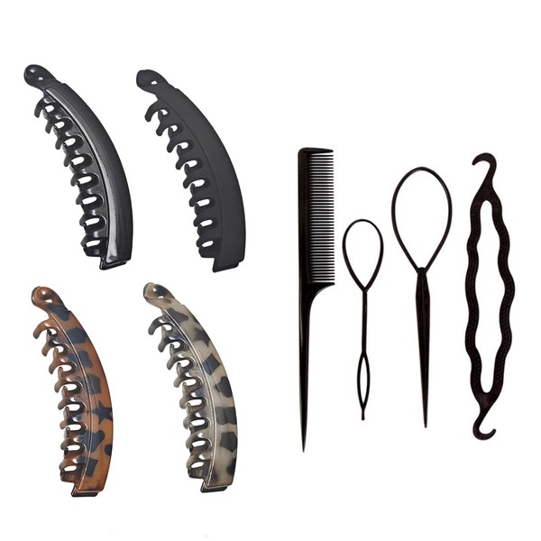 4 x Bananen-Haarnadeln (glänzend/matt/Schildkröte) + Frisier-Set, lockiges Haar, rutschfest