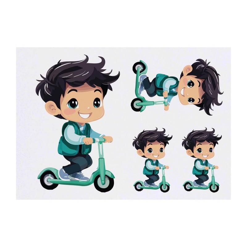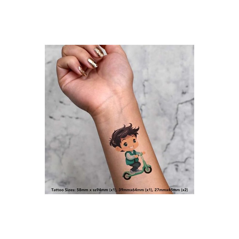 4 x 'Boy Riding A Scooter' Temporary Tattoos - Water Resistant, Skin-Safe, Non-Toxic Transfers, Mixed Sizes (TO00072462)