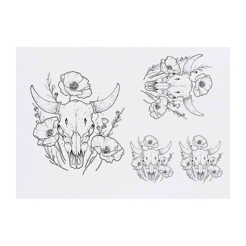 4 x 'Bull Skull with Flowers' Temporary Tattoos - Water Resistant, Skin-Safe, Non-Toxic Transfers, Mixed Sizes (TO00073200)