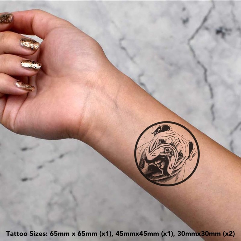 4 x 'Bulldog in Circle Frame' Temporary Tattoos - Water Resistant, Skin-Safe, Non-Toxic Transfers, Mixed Sizes (TO00069206)