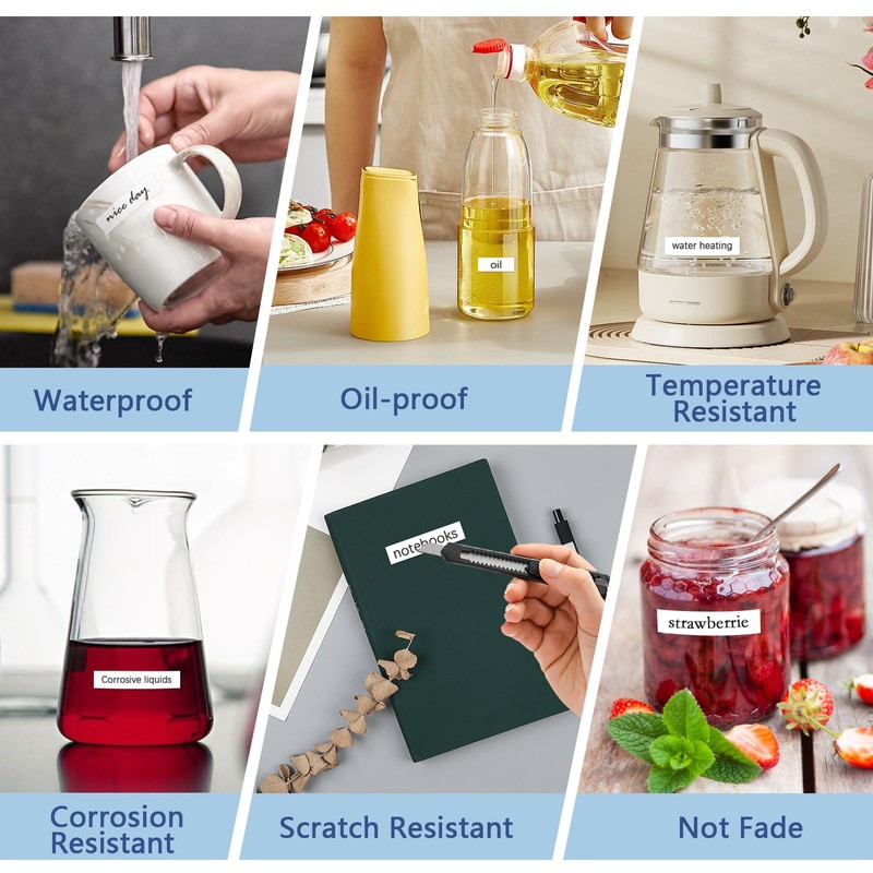 - Durable & Durable Our replacement label tape is waterproof, oil resistant, abrasion resistant, corrosion resistant, fade resistant, temperature resistant, UV resistant, durable, adaptable to dry or humid environment, not fade even after long time storage.
