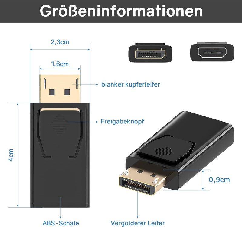 The material of the Displayport HDMI adapter is made of ABS, copper core. The size is 5 x 2 x 0.9 cm. Well proportioned and extremely compact. It is portable and usable and requires almost no annoying cables.
