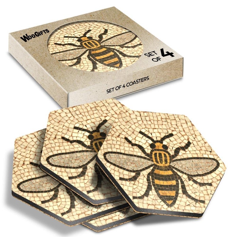 4 x Hexagon Coasters - Manchester Bee Mosaic Pattern Cork Backed MDF Glossy Tea Coffee Accessory #51408