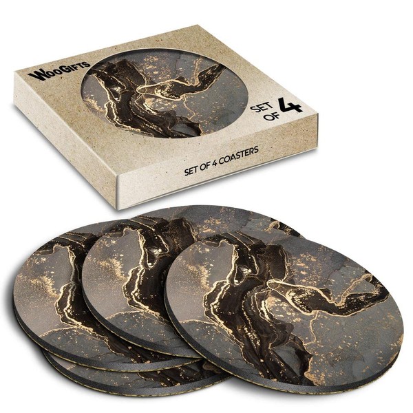 4 x Round Coasters - Black & Gold Style Marble Ink Art Cork Backed MDF Glossy Tea Coffee Accessory #170400