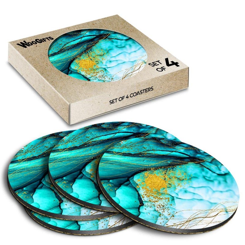 4 x Round Coasters - Teal Green Blue Ink Effect Marble Cork Backed MDF Glossy Tea Coffee Accessory #53473