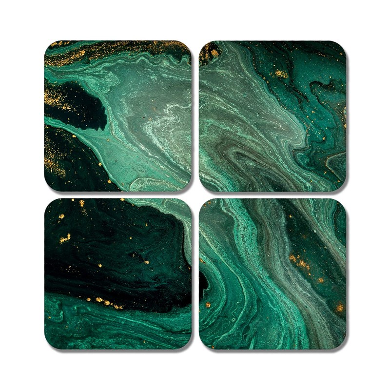 4 x Square Marble Effect Coasters - Art Green Agate Gold Ink Jigsaw Gift #78323