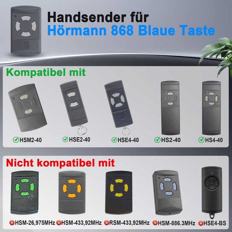 • Kompatibilität Modelle: Ersatz handsender für Hormann HSM4-40 Festcode mit blauen Tasten. für Hormann HSE2-40 HSE4-40 HS4-40 HS1-40 HS2-40 HSM2-40 HSM4-40
