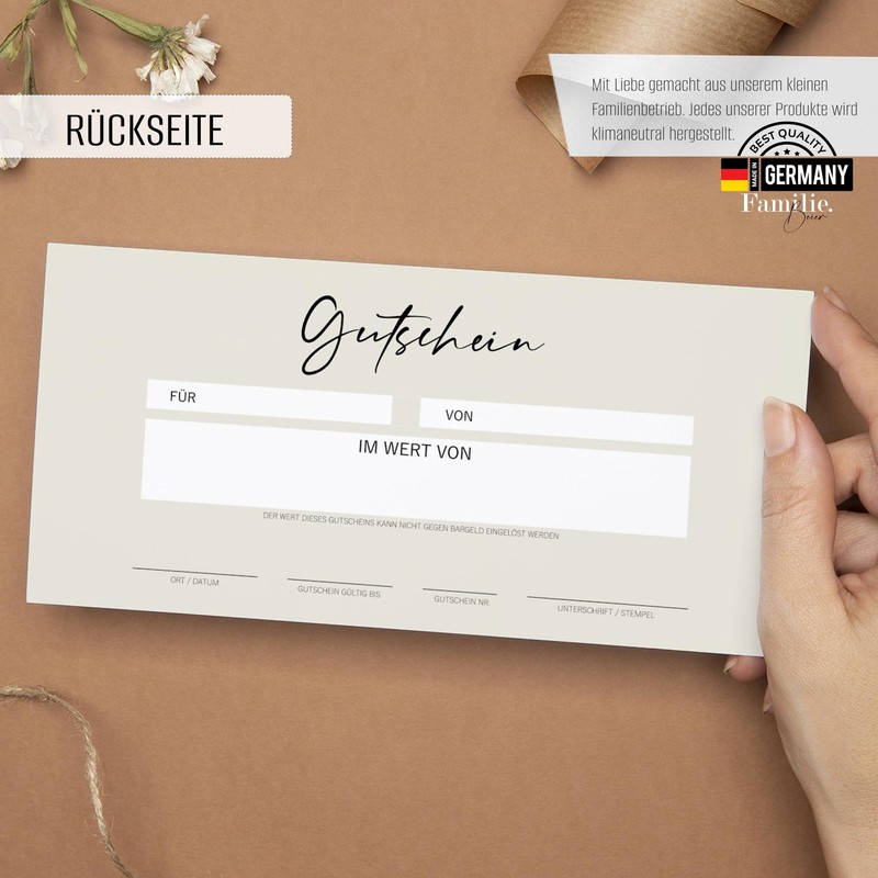 Thanks to the elegant design, you are guaranteed to be remembered by your customers beautiful company. Our vouchers set you apart from the competition - because the vouchers are not standard vouchers. Quality: Our vouchers are printed on high-quality paper or cardboard using the latest printing technology.