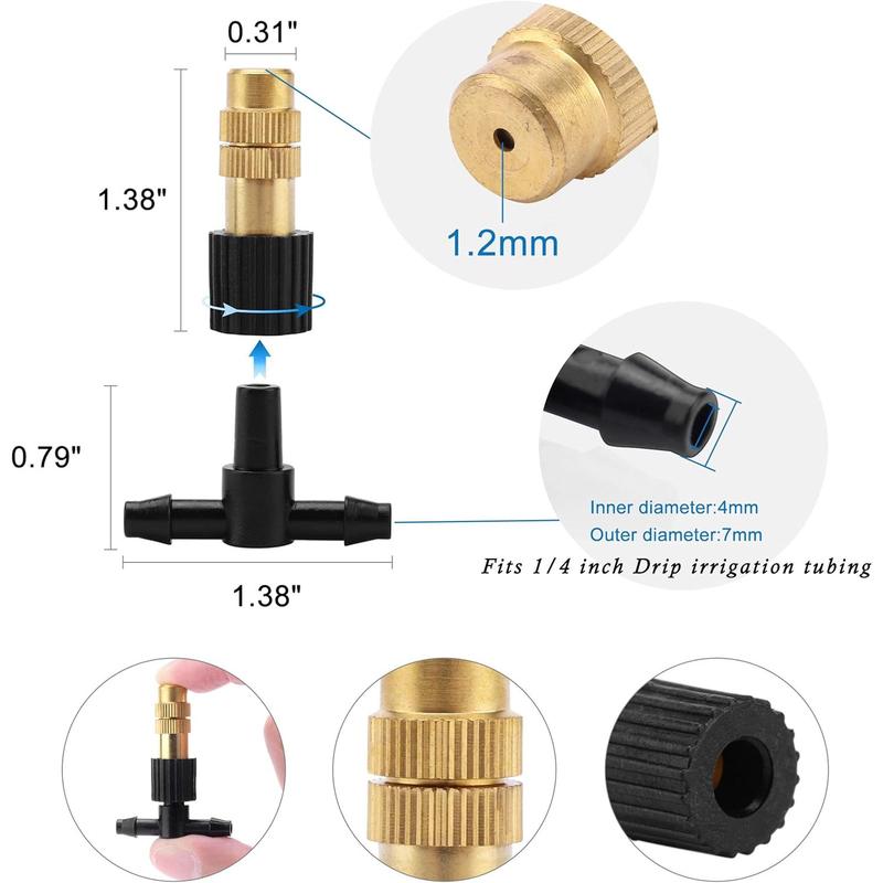 【Package】: Three-Way Atomizing Nozzle drip irrigation Kit comes with 40 count brass misting nozzles, and 40 count plastic drip Irrigation Connectors a set. Help cooling the air and widely suitable for Cooling Misting System for Outdoor Garden Patio Greenhouse.