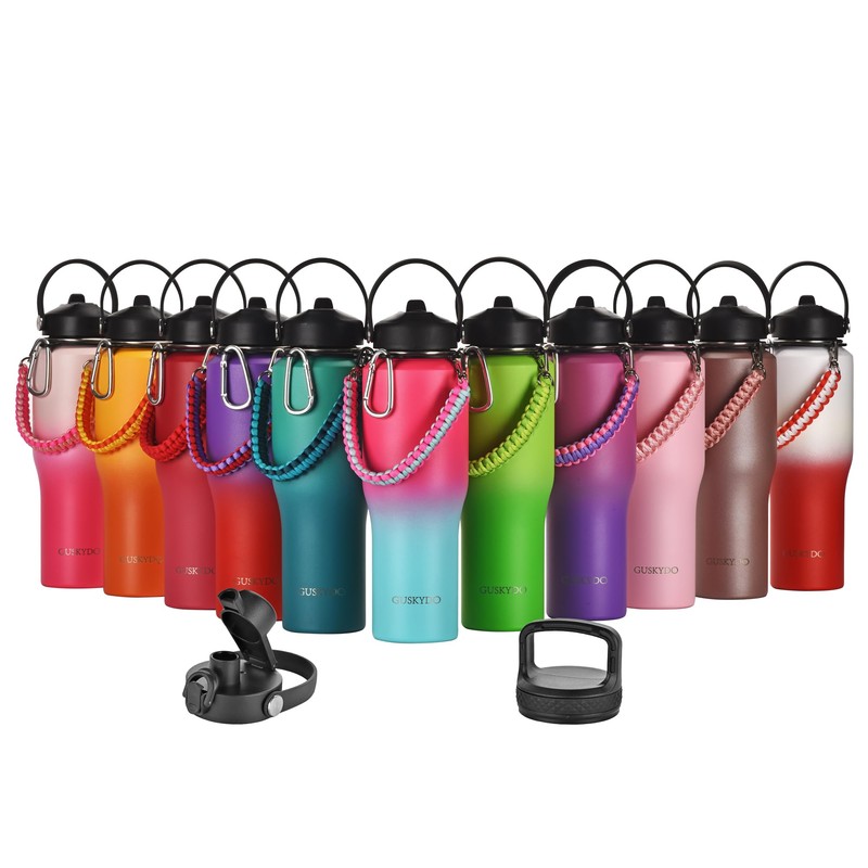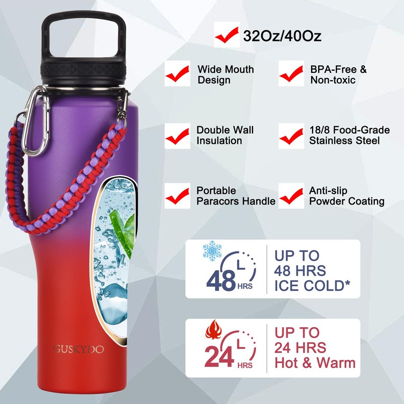 - 【HIGHEST QUALITY SERVICE 】: Included with 3wide mouth lids,1 a shoulder strap a, 1 survival paracord, 2 straws, and 1 straw brush, this GUSKYDO insulated bottle is fully accessorized to handle any tricky situations. We offer a lifetime warranty toward the T-shaped bottles, and our friendly customer care is always happy to help.