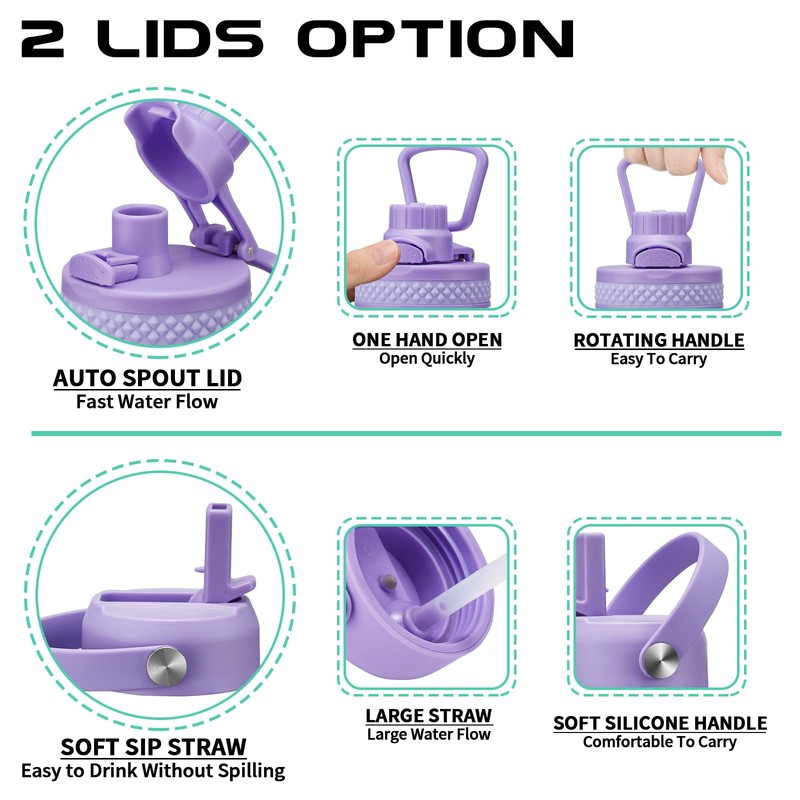 • 2 LIDS—100% Leak Proof: the auto spout cap & straw lid provide your different drinking experience. The ONE-HAND operation pop-up spout lid for convenient enjoy your fast water flow. The SPILL-PROOF straw lid with high flow rate & BPA free. Both 2 lids design with a sturdy handle, making the thermal water bottle more convenient to carry