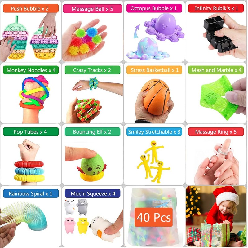 - 【40 pieces fidget toys set package includes】: 2*push bubble fidget toy, 4*stretchy string, 4*mesh and marble toys, 5*stre-ss ball, 1*Infini-ty cube, 4*mochi squeeze toys, 2*crazy tracks, 4*pop tubes, 1*octopus push bubble, 1*rainbow spiral springs, 2*small emoji dolls, 3*smiley stretchable toy, 1*anti-stress basketball, 1*po-p fidget toy, 5*massage finger ring.