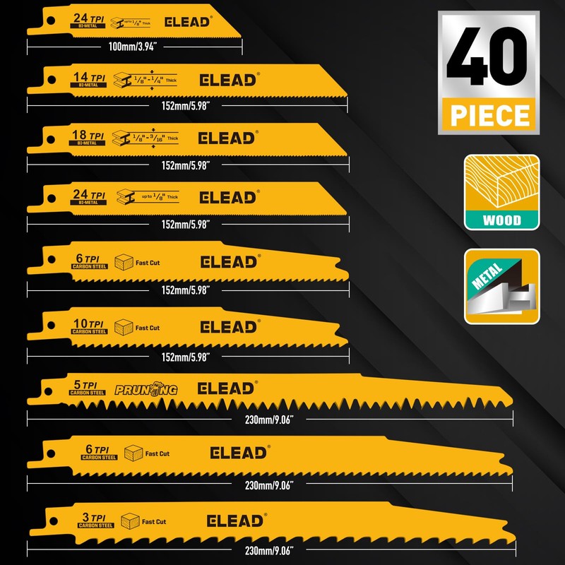 - EXCEPTIONAL SHARPNESS – 40-piece reciprocating saw blade set with razor-sharp edges, delivering precise, smooth, and efficient cuts for both woodworking and metal cutting projects.