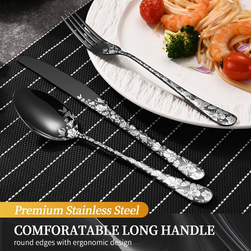 - 【Unique & Elegant Design】 : Our silverware set features a distinctive laser print flower designfor an elegant look and unique style with smooth mirror polished edges. Impress your family and friends.