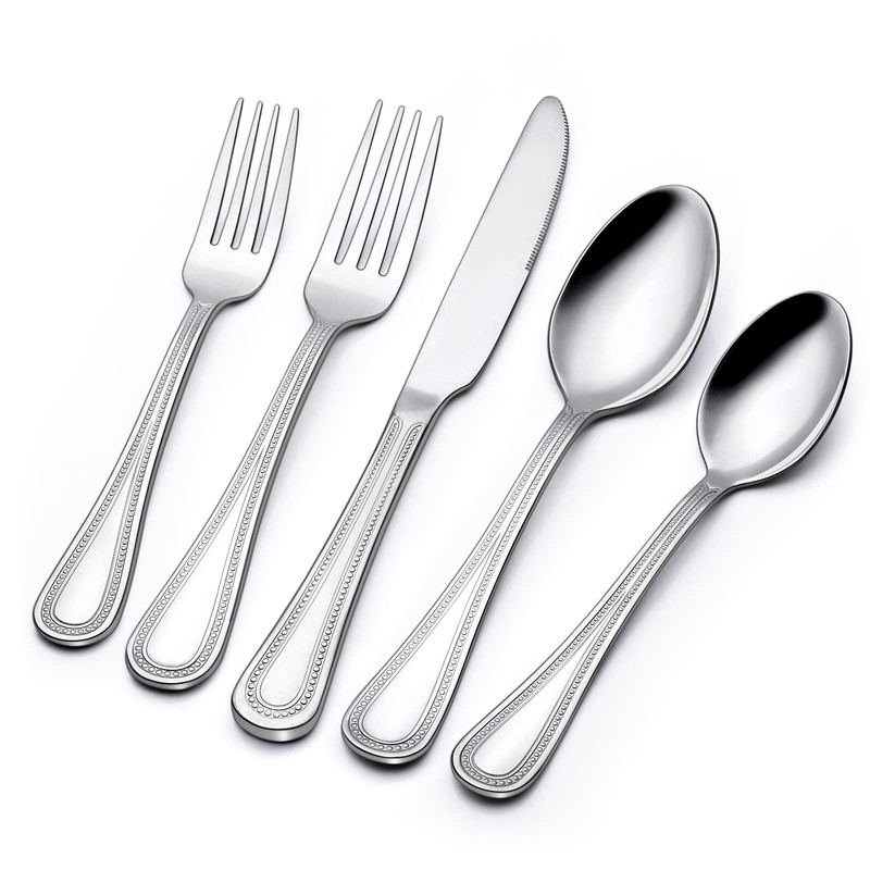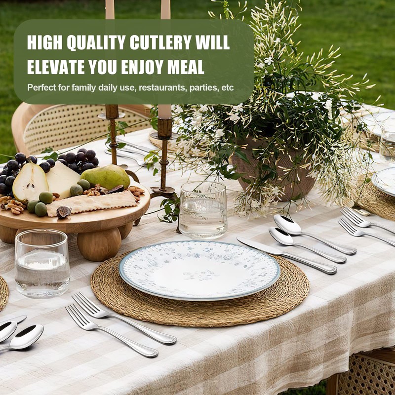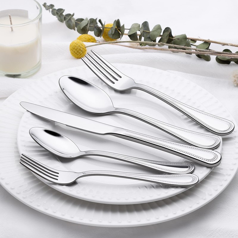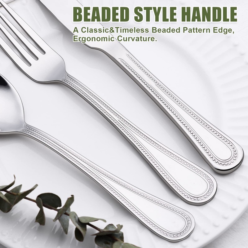 - 【CLASSIC STYLE WITH BEADED HANDLE DESIGN】 The flatware set features teardrop handles embellished with a beaded border and rounded end. The classic, timeless beaded pattern in the handle border looks like gleaming jewelry, which is gorgeous and can enhance elegance to our table.
