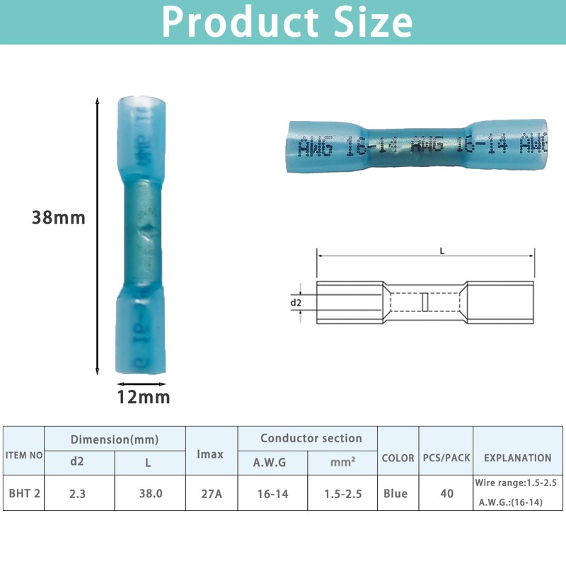 - Package Included The package comes with 40 pieces 16-14 AWG heat shrink tubing with heat shrink tubing, waterproof and conductive properties, length 36mm, inner diameter 2.3, maximum current 27A, which are enough to meet your various needs.